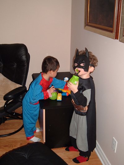 A couple of superheroes, hanging out at the superhero bar.